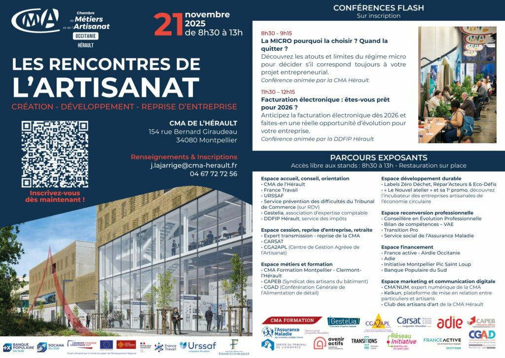 Lieu : Chambre de Métiers et de l’Artisanat de l’Hérault – 154 rue Bernard Giraudeau, Montpellier